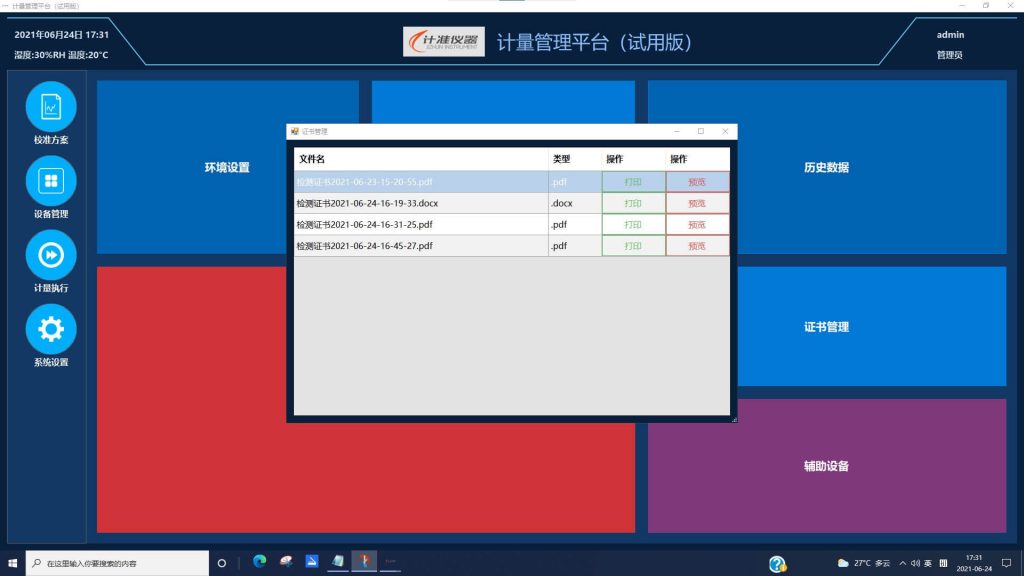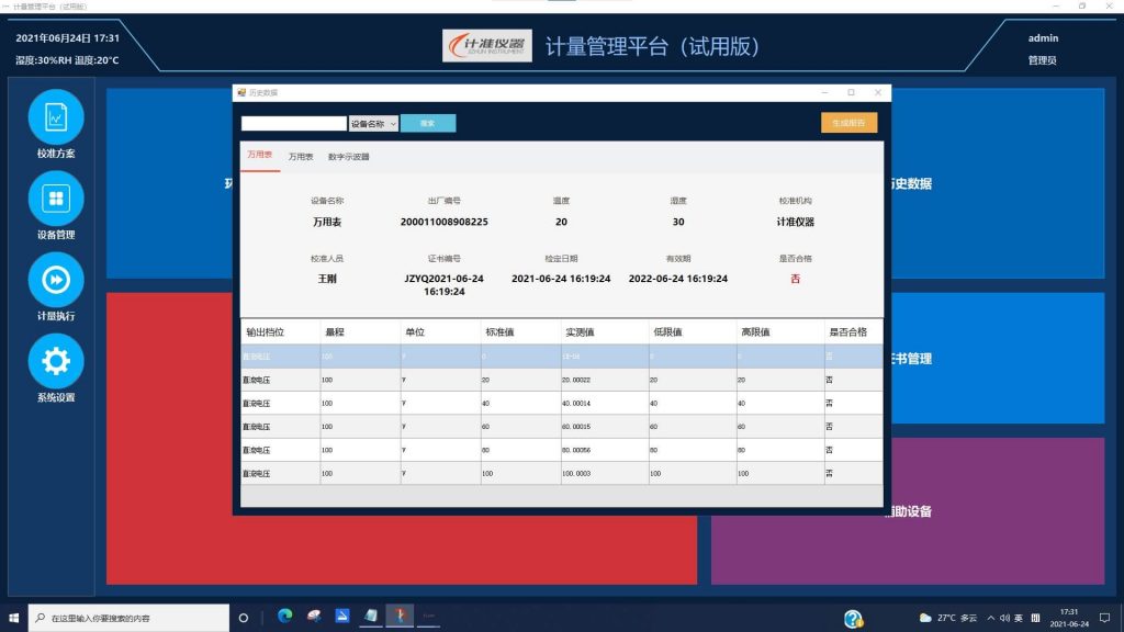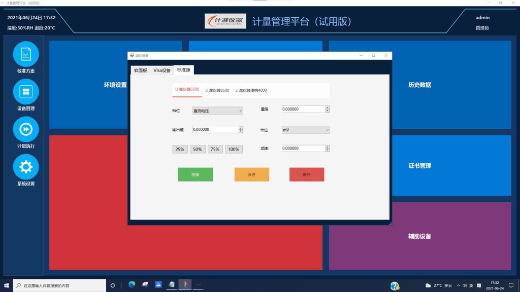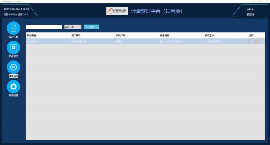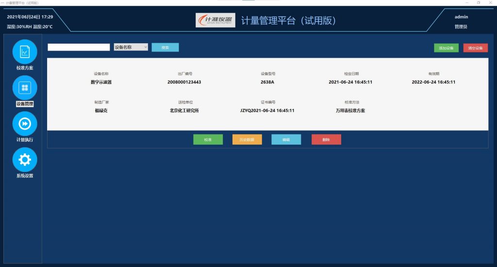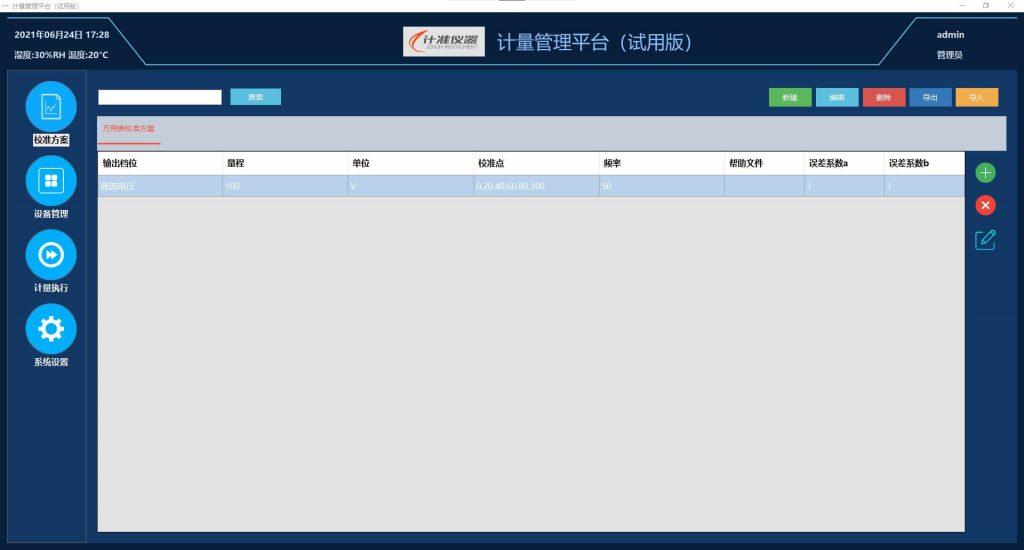 北京计准仪器技术开发有限公司自主开发的仪器计量管理平台v2.0隆重上线,现免费提供试用版,欢迎广大客户试用。软件采用灵活可扩展的设计架构,支持市面上大部分主流品牌的标准源的连接控制,具备全自动校准,远程智能校准,设备管理,证书报告自动生成(支持word,PDF)等特色功能,人性化设计的UI,操作简单直接,为您提供专业可靠的一站式计量检测服务平台。